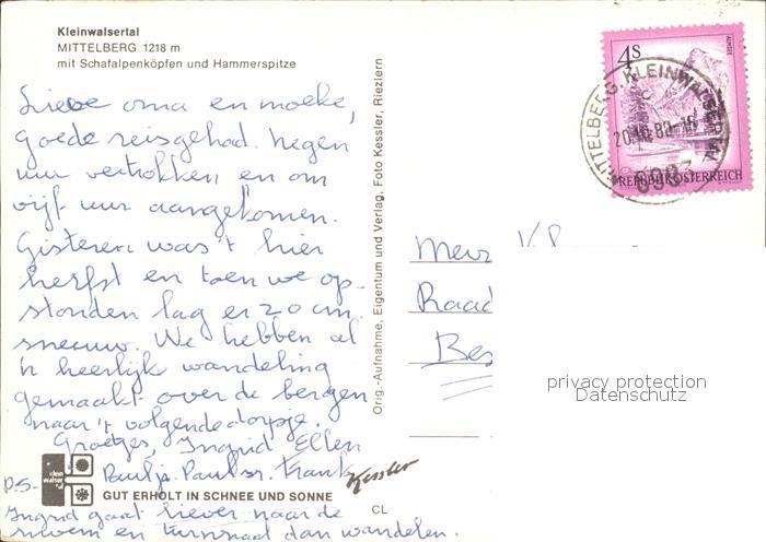 72097509 alte Postkarte Mittelberg Kleinwalsertal mit Schafalpenkoepfen und Hammerspitze postalisch gelaufen Erhaltung siehe scans KatCode: 11390