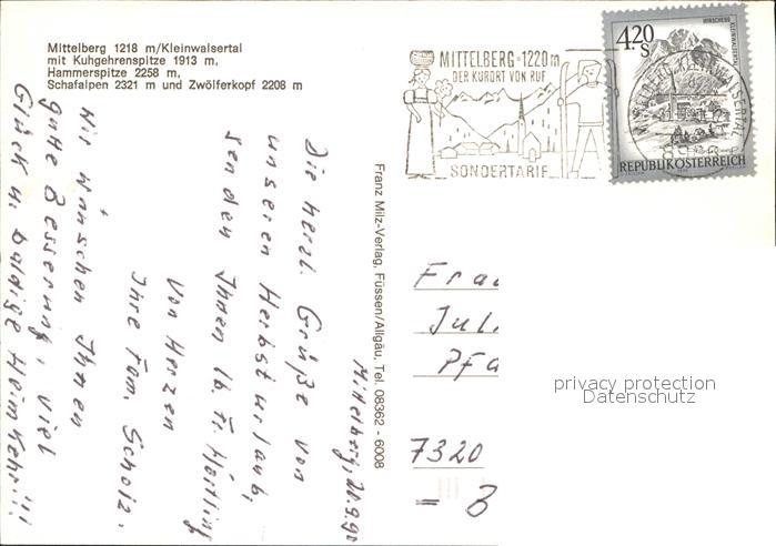 71539349 alte Postkarte Mittelberg Kleinwalsertal Panorama mit Kuhgehrenspitze Hammerspitze Schafalpen Zwoelferkopf postalisch gelaufen Erhaltung siehe scans KatCode: 11390