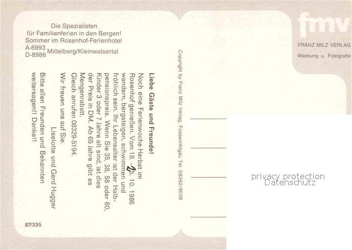 72900763 Mittelberg Kleinwalsertal Rosenhof Ferienhotel postalisch nicht gelaufen Erhaltung siehe scans [AndreD76] KatCode: 11390