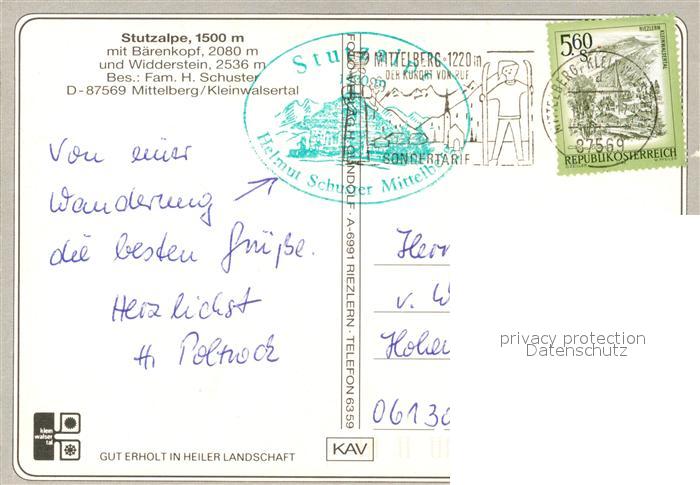 73312297 alte Postkarte Mittelberg Kleinwalsertal Stutzalpe mit Baerenkopf und Widderstein Allgaeuer Alpen postalisch gelaufen Erhaltung siehe scans [FriedD77] KatCode: 11390