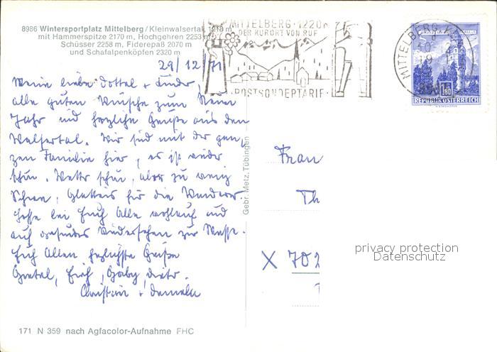 72521523 alte Postkarte Mittelberg Kleinwalsertal Teilansicht mit Hammerspitze Hochgehren Schuesser postalisch gelaufen Erhaltung siehe scans KatCode: 11390