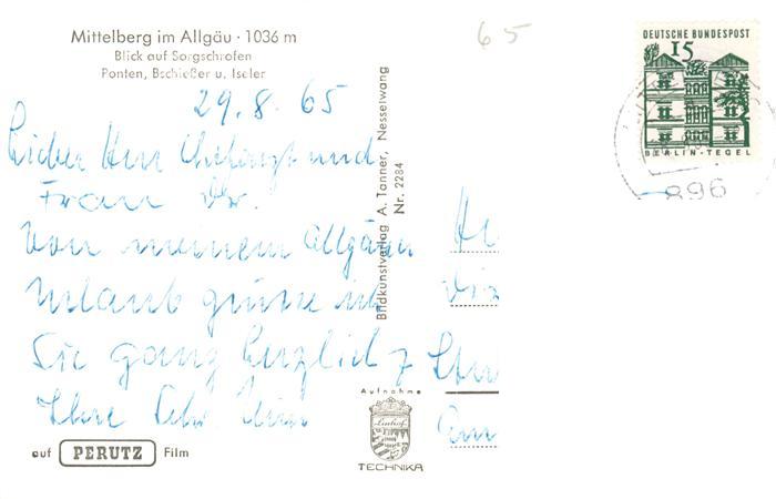 73897761 alte Postkarte Mittelberg Oy Blick auf Sorgschrofen Ponten Bschiesser und Iseler postalisch gelaufen Erhaltung siehe scans [WerneD78] KatCode: 11110009780128