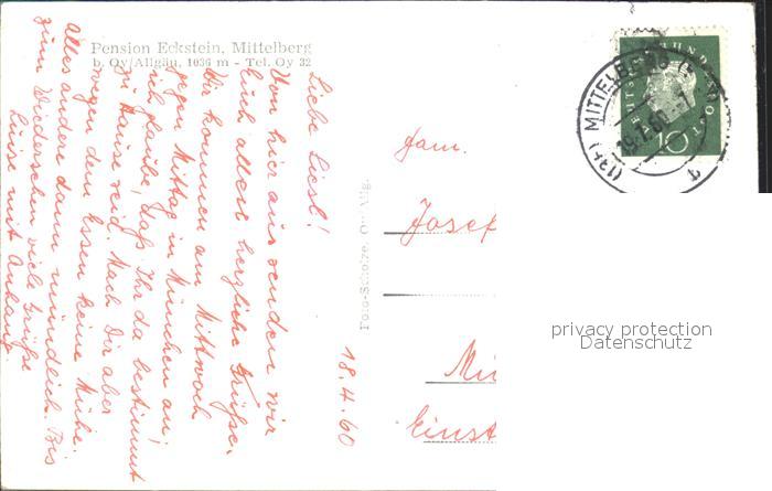 72149695 alte Postkarte Mittelberg Oy Pension Eckstein postalisch gelaufen Erhaltung siehe scans KatCode: 11110009780128