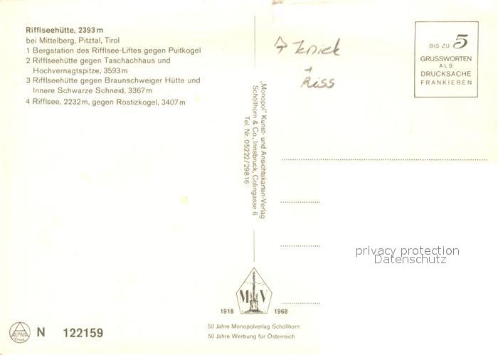 73091595 Mittelberg Pitztal Tirol Rifflseehuette postalisch nicht gelaufen Erhaltung siehe scans [KathaD81] KatCode: 11390