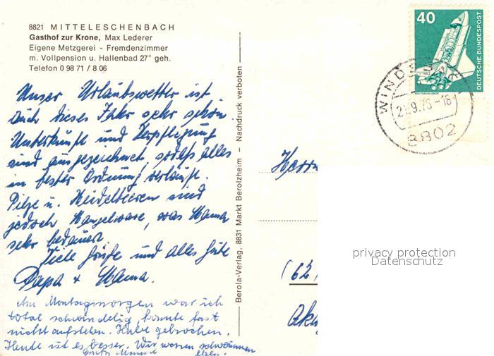72851931 alte Postkarte Mitteleschenbach Gasthof zur Krone Hallenbad Dachterrasse postalisch gelaufen Erhaltung siehe scans [FriedD77] KatCode: 11110009571178