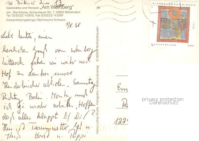73743607 alte Postkarte Mittelndorf Gaststaette Pension Am Weinberg Gaststube Elbsandsteingebirge postalisch gelaufen Erhaltung siehe scans [WerneD78] KatCode: 11110014287180