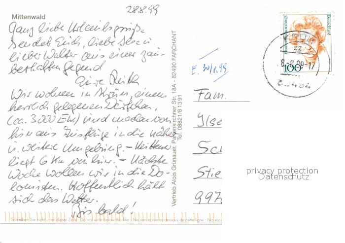 72871309 alte Postkarte Mittenwald Bayern postalisch gelaufen Erhaltung siehe scans [LiesaD40] KatCode: 11110009180123
