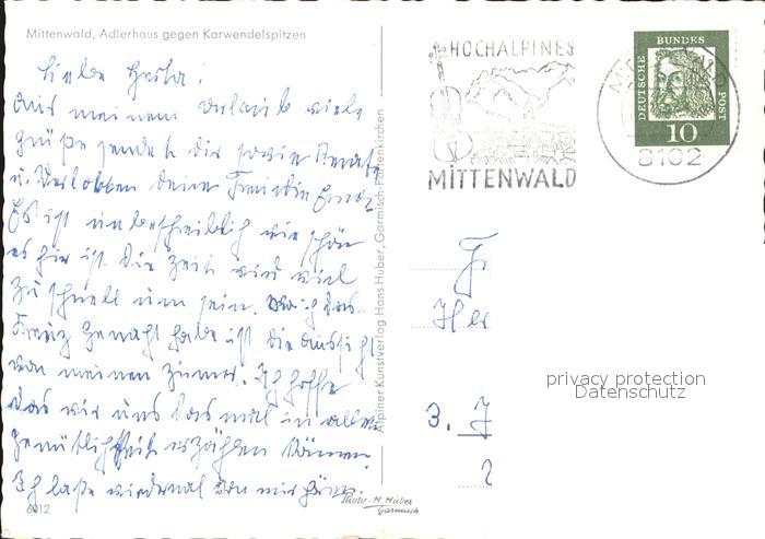 72465522 alte Postkarte Mittenwald Bayern Adlerhaus Karwendelgebirge postalisch gelaufen Erhaltung siehe scans KatCode: 11110009180123