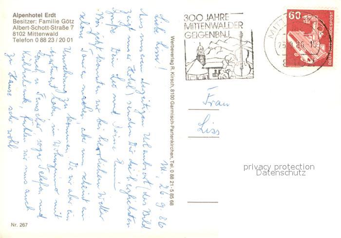 73720296 alte Postkarte Mittenwald Bayern Alpenhotel Erdt postalisch gelaufen Erhaltung siehe scans [WerneD78] KatCode: 11110009180123