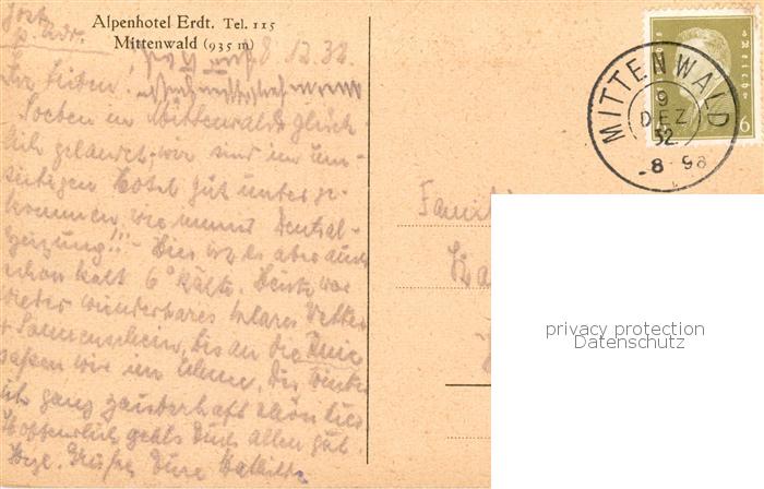 73820263 alte Postkarte Mittenwald Bayern Alpenhotel postalisch gelaufen Erhaltung siehe scans [FriedD77] KatCode: 11110009180123
