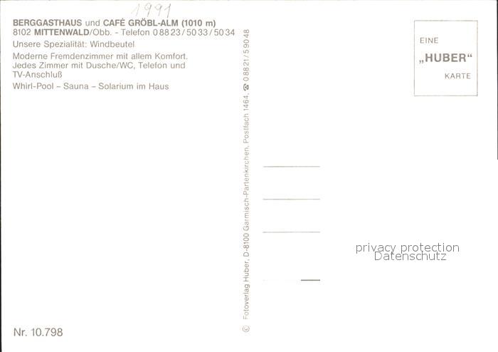 72114004 Mittenwald Bayern Berggasthaus und Cafe Groebl Alm Terrasse Gaststube Zimmer postalisch nicht gelaufen KatCode: 11110009180123