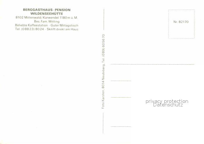 72907282 Mittenwald Bayern Berggasthaus Wildenseehuette postalisch nicht gelaufen Erhaltung siehe scans [AndreD76] KatCode: 11110009180123