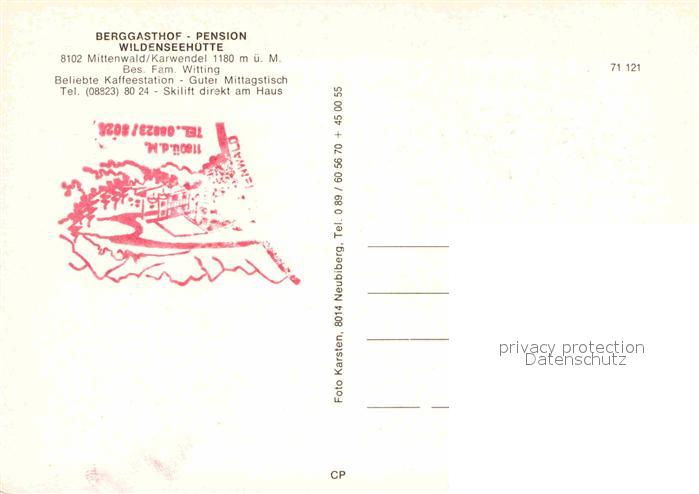 72837365 Mittenwald Bayern Berggasthof Wildenseehuette postalisch nicht gelaufen Erhaltung siehe scans [NatalD47] KatCode: 11110009180123