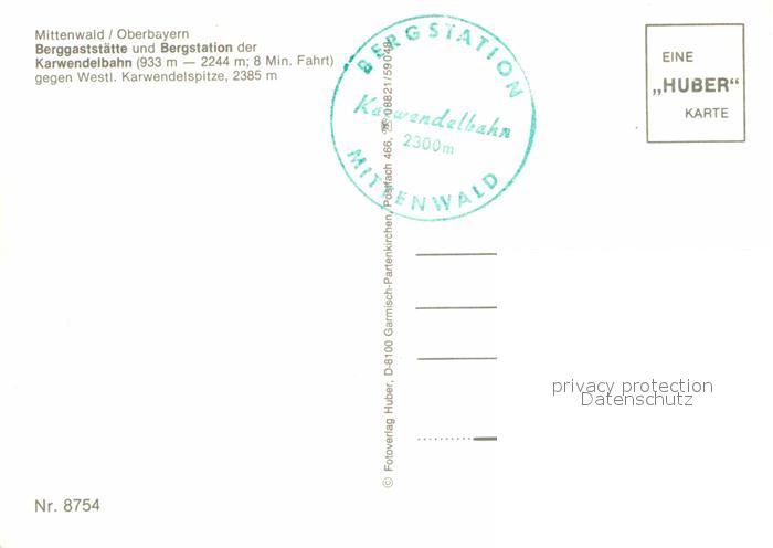 72902921 Mittenwald Bayern Berggaststaette Bergstation der Karwendelbahn Karwendelgebirge Huber Karte Nr 8754 postalisch nicht gelaufen Erhaltung siehe scans [FriedD77] KatCode: 11110009180123