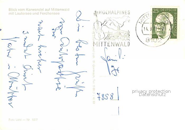 72859290 alte Postkarte Mittenwald Bayern Blick vom Karwendel mit Lautersee und Ferchesee postalisch gelaufen Erhaltung siehe scans [WerneD78] KatCode: 11110009180123