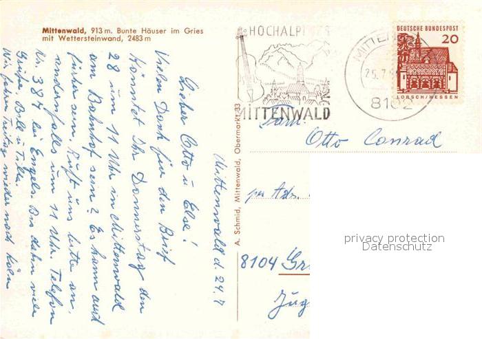 72724172 alte Postkarte Mittenwald Bayern Bunte Haeuser im Gries mit Wettersteinwand Fassadenmalerei postalisch gelaufen Erhaltung siehe scans [FriedD77] KatCode: 11110009180123