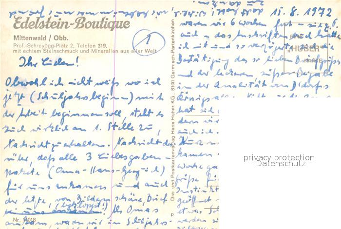 73725566 Mittenwald Bayern Edelstein Boutique Kirchturm Berghotel Alpen postalisch nicht gelaufen Erhaltung siehe scans [FriedD77] KatCode: 11110009180123