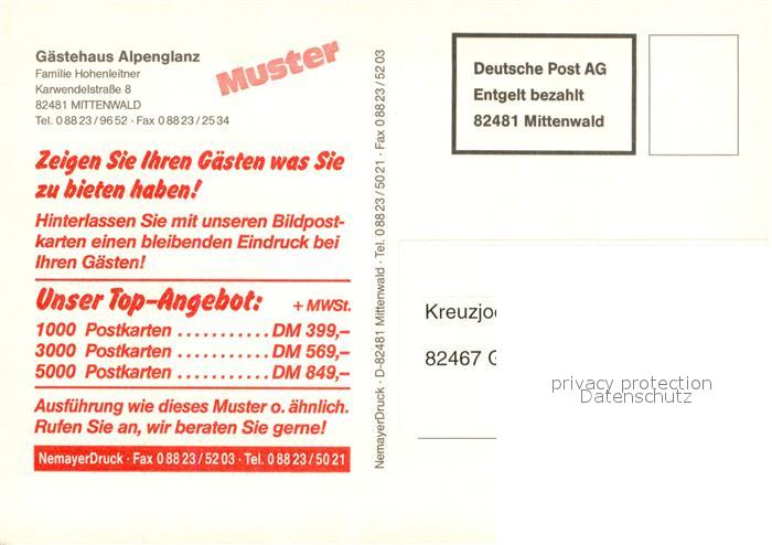 73677842 Mittenwald Bayern Gaestehaus Alpenglanz postalisch nicht gelaufen Erhaltung siehe scans [WerneD78] KatCode: 11110009180123