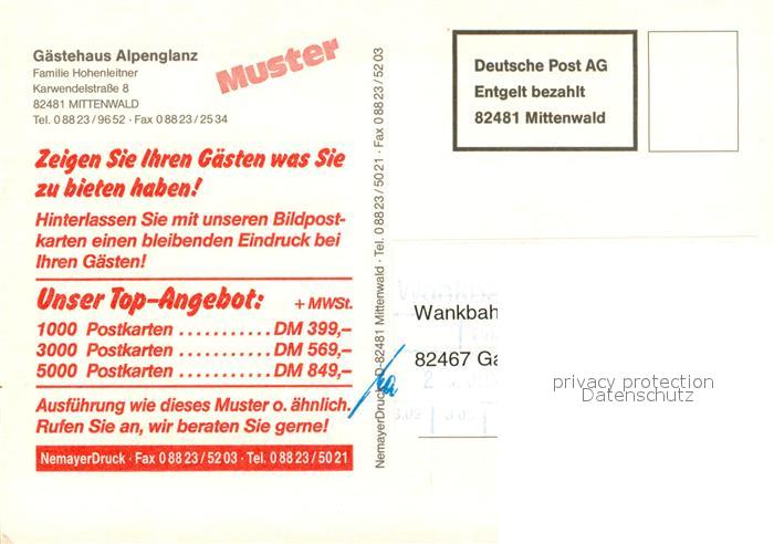 73678878 Mittenwald Bayern Gaestehaus Alpenglanz postalisch nicht gelaufen Erhaltung siehe scans [FriedD77] KatCode: 11110009180123