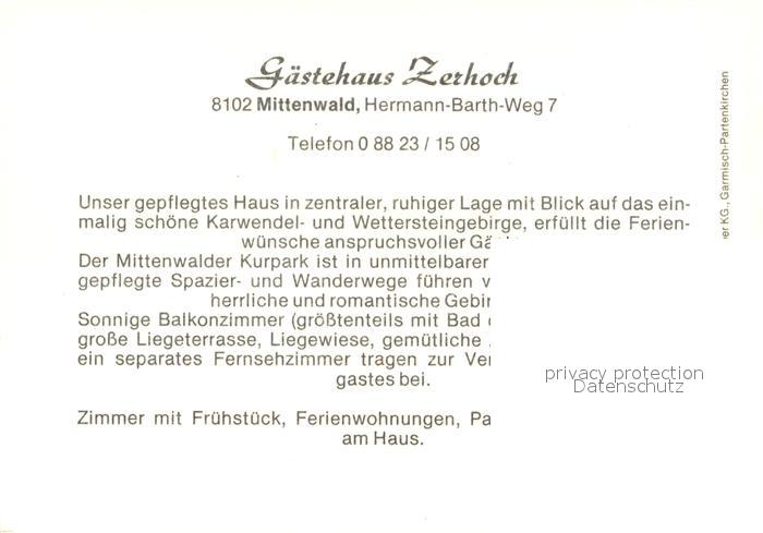 73653779 Mittenwald Bayern Gaestehaus Zerhoch Restaurant Fremdenzimmer postalisch nicht gelaufen Werbekarte (keine Postkarte) Erhaltung siehe scans [FriedD77] KatCode: 11110009180123
