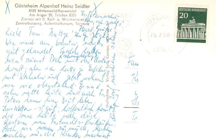 73911523 alte Postkarte Mittenwald Bayern Gaesteheim Alpenhof Heinz Seidler postalisch gelaufen Erhaltung siehe scans [WerneD78] KatCode: 11110009180123