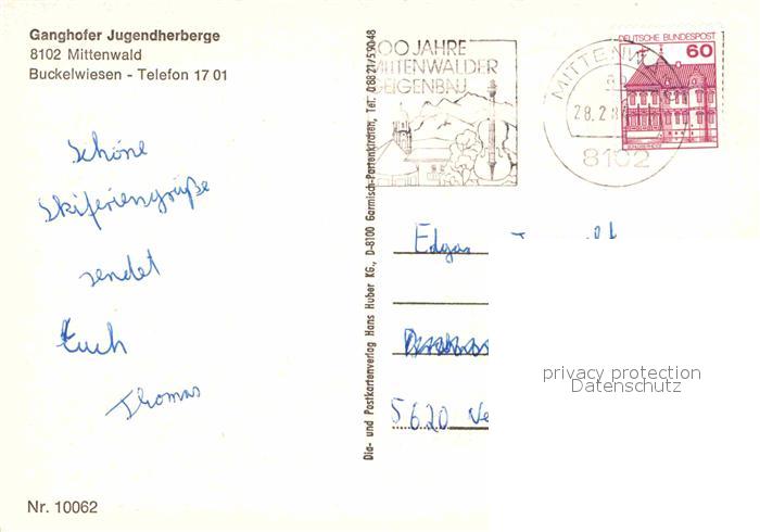 72726645 alte Postkarte Mittenwald Bayern Ganghofer Jugendherberge postalisch gelaufen Erhaltung siehe scans [WerneD78] KatCode: 11110009180123
