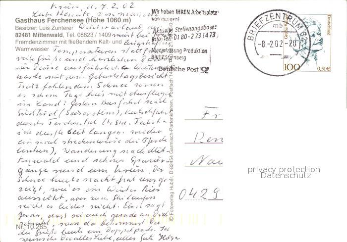 71939035 alte Postkarte Mittenwald Bayern Gasthaus Ferchensee postalisch gelaufen Erhaltung siehe scans KatCode: 11110009180123