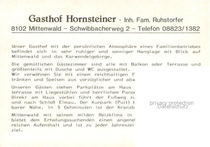 73636238 Mittenwald Bayern Gasthof Hornsteiner Terrasse postalisch nicht gelaufen Werbekarte (keine Postkarte) Erhaltung siehe scans [FriedD77] KatCode: 11110009180123