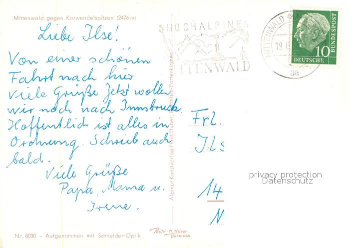 73241200 alte Postkarte Mittenwald Bayern gegen Karwendelspitze postalisch gelaufen Erhaltung siehe scans [LiesaD40] KatCode: 11110009180123