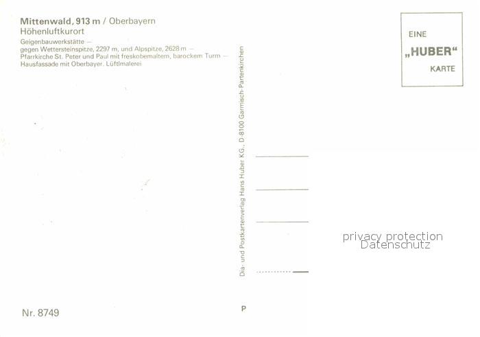 72858422 Mittenwald Bayern Geigenbauwerkstaette Panorama Pfarrkirche St Peter und Paul Hausfassade mit Lueftlmalerei postalisch nicht gelaufen Erhaltung siehe scans [WerneD78] KatCode: 11110009180123