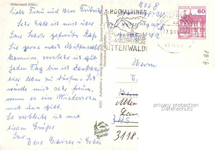 72722013 alte Postkarte Mittenwald Bayern Gesamtansicht mit Alpenpanorama Alte Haeuser Fassadenmalerei Kirche postalisch gelaufen Erhaltung siehe scans [FriedD77] KatCode: 11110009180123