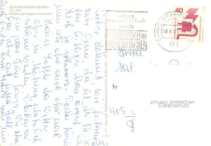73720302 alte Postkarte Mittenwald Bayern Geschenkhaus Neuner Ortsansicht mit Karwendel postalisch gelaufen Erhaltung siehe scans [WerneD78] KatCode: 11110009180123