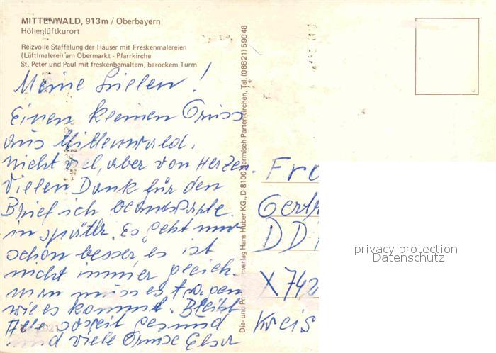 72766010 alte Postkarte Mittenwald Bayern Haeuserpartie am Obermarkt Lueftlmalerei Pfarrkirche postalisch gelaufen Erhaltung siehe scans [FriedD77] KatCode: 11110009180123