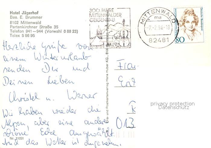 73109314 alte Postkarte Mittenwald Bayern Hotel Jaegerhof Winteraufnahme postalisch gelaufen Erhaltung siehe scans [KathaD81] KatCode: 11110009180123