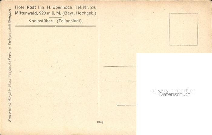 72130460 Mittenwald Bayern Hotel Post Kneipstueberl postalisch nicht gelaufen Erhaltung siehe scans KatCode: 11110009180123