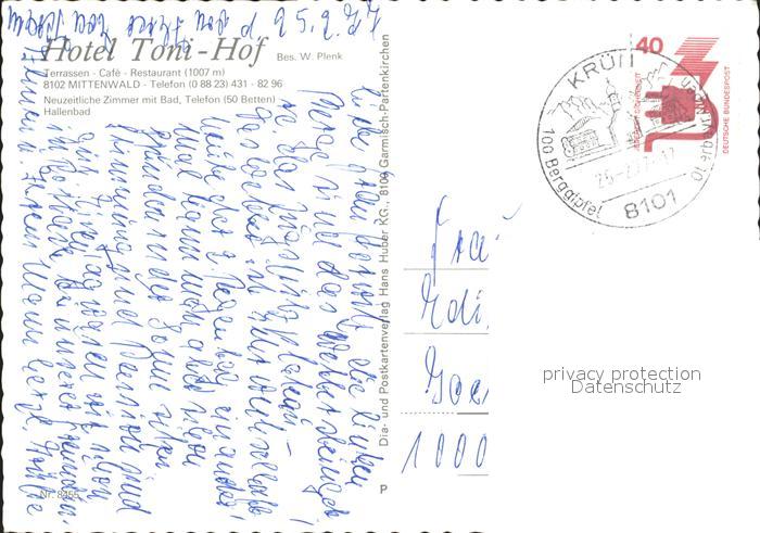 72054748 alte Postkarte Mittenwald Bayern Hotel Toni Hof postalisch gelaufen Erhaltung siehe scans KatCode: 11110009180123