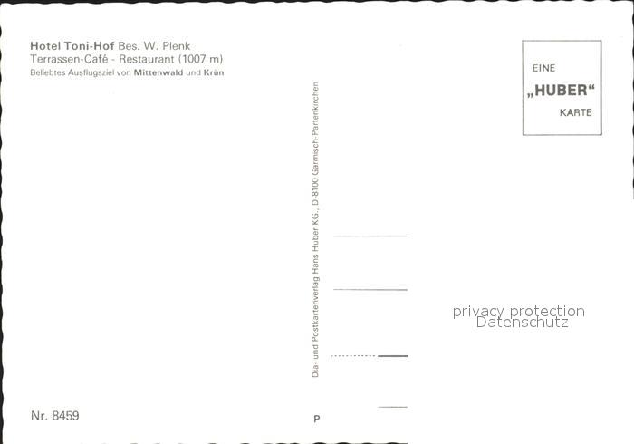 72282290 Mittenwald Bayern Hotel Toni Hof Alpenblick Huber Karte Nr 8459 postalisch nicht gelaufen Erhaltung siehe scans KatCode: 11110009180123