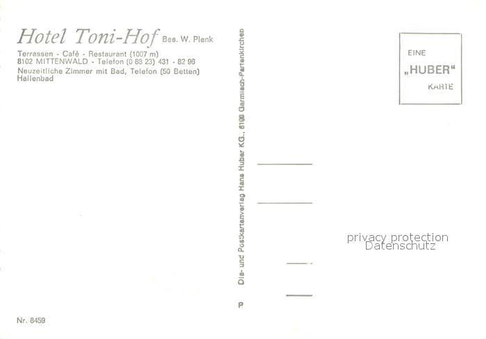 73711934 Mittenwald Bayern Hotel Toni-Hof Aussenansicht m. Terrasse postalisch nicht gelaufen Erhaltung siehe scans [LiesaD40] KatCode: 11110009180123