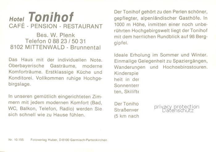 73099385 Mittenwald Bayern Hotel Tonihof Gastraum Zimmer Hallenbad postalisch nicht gelaufen Werbekarte (keine Postkarte) Erhaltung siehe scans [WerneD78] KatCode: 11110009180123