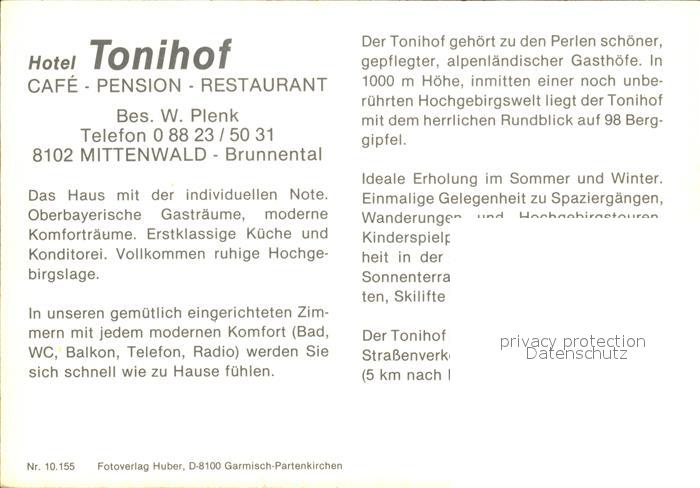72478423 Mittenwald Bayern Hotel Tonihof Gaststube Hallenbad Zimmer postalisch nicht gelaufen Werbekarte (keine Postkarte) Erhaltung siehe scans KatCode: 11110009180123