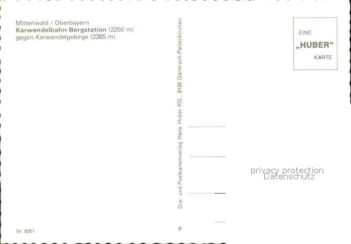 72496677 Mittenwald Bayern Karwendelbahn Bergstation Karwendelgebirge Huber Karte Nr 8351 postalisch nicht gelaufen Erhaltung siehe scans KatCode: 11110009180123