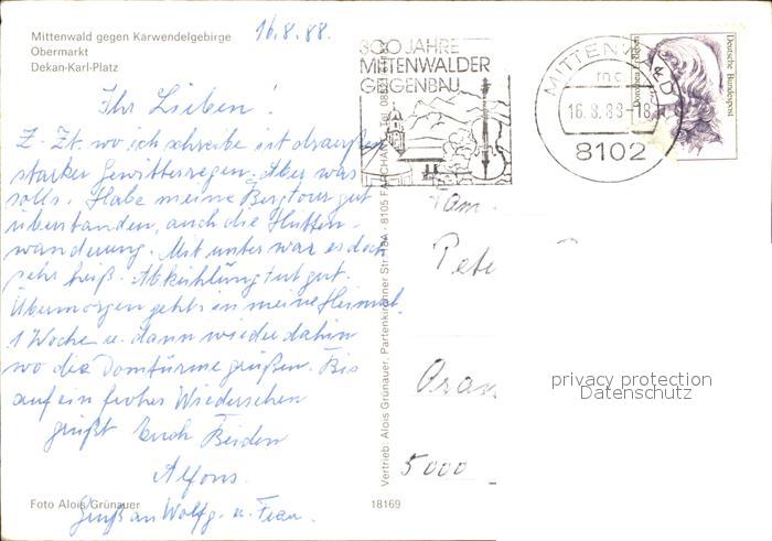 72574357 alte Postkarte Mittenwald Bayern Karwendelgebirge Obermarkt Dekan Karl Platz postalisch gelaufen Erhaltung siehe scans [KathaD79] KatCode: 11110009180123