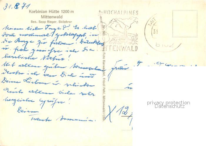 73647635 alte Postkarte Mittenwald Bayern Korbinian Huette Terrasse Brunnen postalisch gelaufen Erhaltung siehe scans [WerneD78] KatCode: 11110009180123