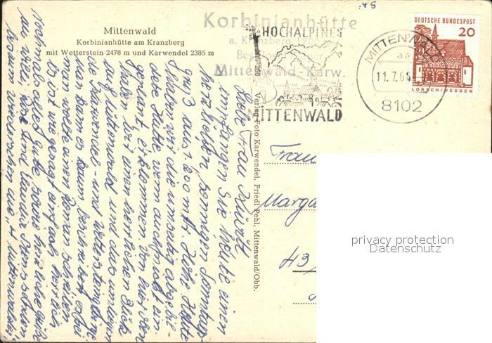 72526423 alte Postkarte Mittenwald Bayern Korbinianhuette Kranzberg postalisch gelaufen Erhaltung siehe scans KatCode: 11110009180123