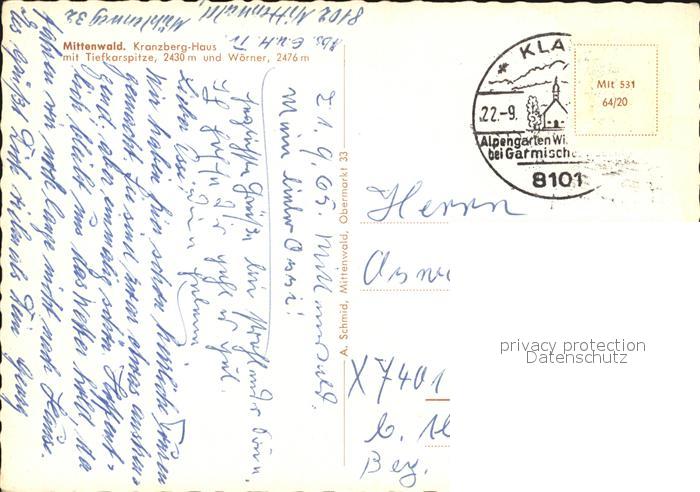 72494092 alte Postkarte Mittenwald Bayern Kranzberg-Haus Tiefkarspitze Woerner postalisch gelaufen Erhaltung siehe scans KatCode: 11110009180123