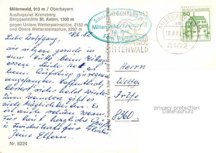 72724022 alte Postkarte Mittenwald Bayern Kranzberg Restaurant St. Anton postalisch gelaufen Erhaltung siehe scans [LiesaD40] KatCode: 11110009180123