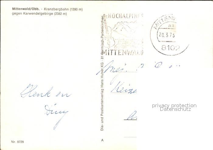 71899624 alte Postkarte Mittenwald Bayern Kranzbergbahn gegen Karwendelgebirge Wintersportplatz postalisch gelaufen Erhaltung siehe scans KatCode: 11110009180123