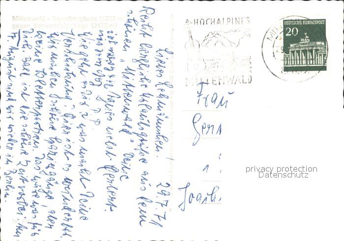 72286648 alte Postkarte Mittenwald Bayern Kranzberghaus postalisch gelaufen Erhaltung siehe scans KatCode: 11110009180123