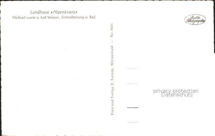 71925213 Mittenwald Bayern Landhaus Alpenkranz postalisch nicht gelaufen Erhaltung siehe scans KatCode: 11110009180123