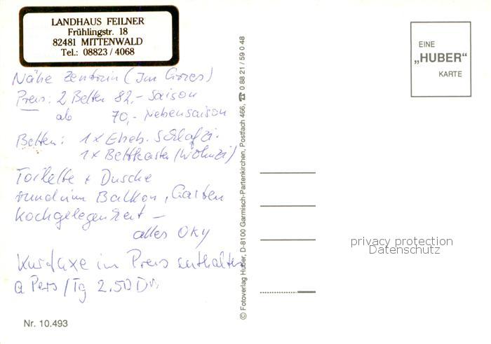 73775972 Mittenwald Bayern Landhaus Feilner postalisch nicht gelaufen Erhaltung siehe scans [WerneD78] KatCode: 11110009180123
